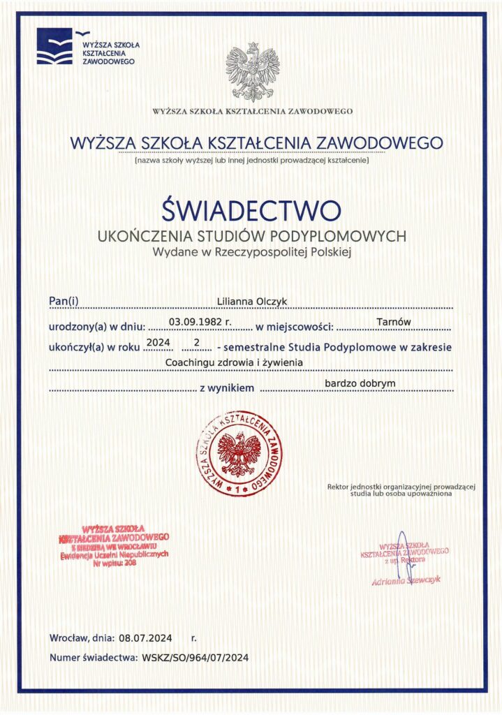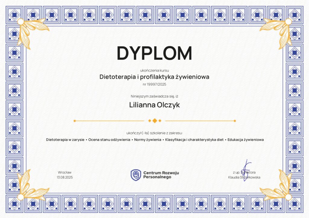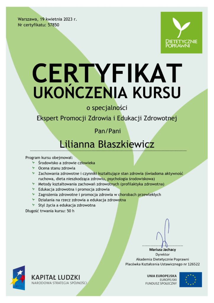 Od lat interesuję się wpływem odżywiania i stylu życia na zdrowie i samopoczucie. Zaczynałam od coachingu zdrowia i żywienia oraz dietoterapii, a obecnie studiuję dietetykę, aby jeszcze pełniej wspierać moich podopiecznych w ich wyzwaniach zdrowotnych.