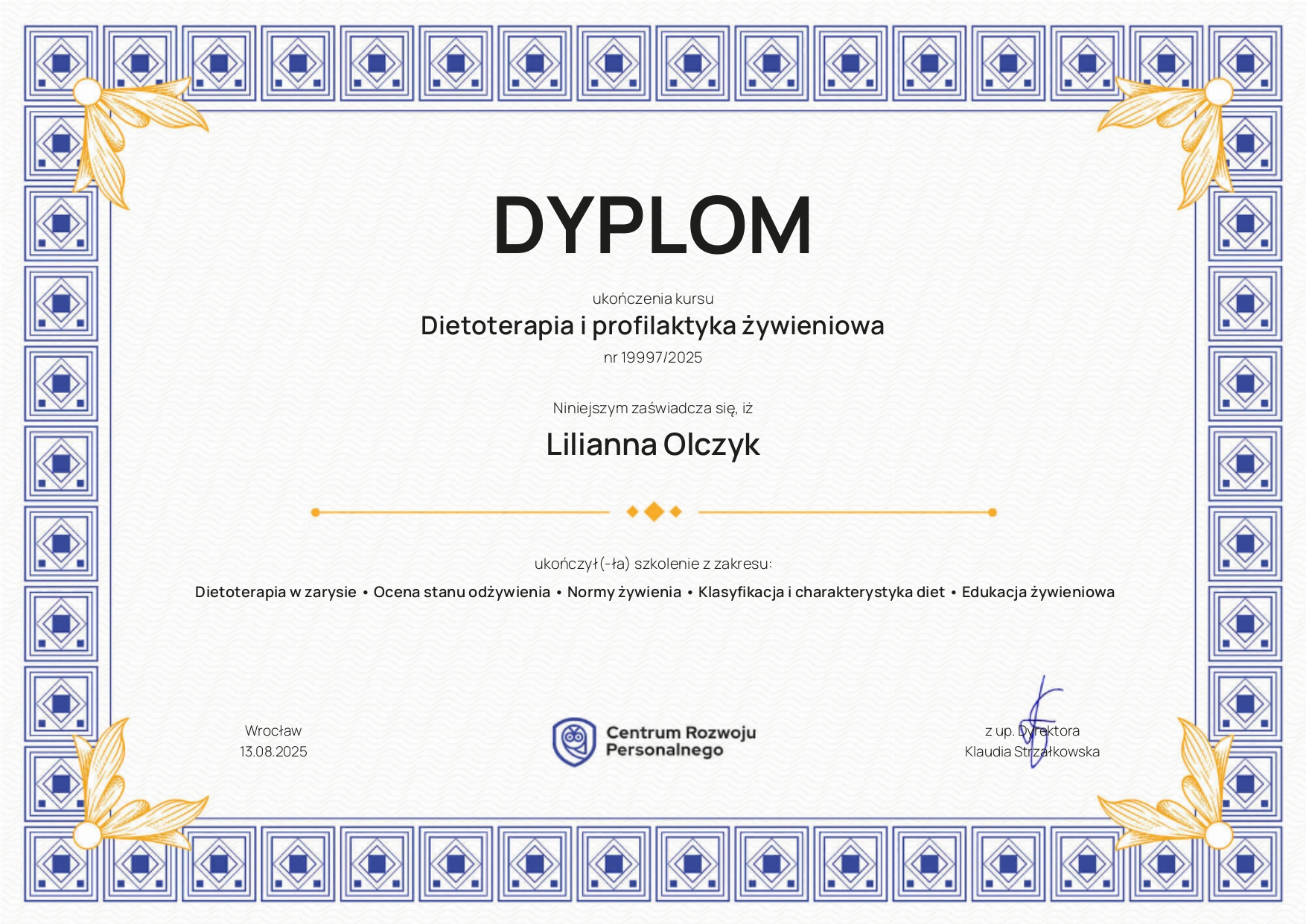 Od lat interesuję się wpływem odżywiania i stylu życia na zdrowie i samopoczucie. Zaczynałam od coachingu zdrowia i żywienia oraz dietoterapii, a obecnie studiuję dietetykę, aby jeszcze pełniej wspierać moich podopiecznych w ich wyzwaniach zdrowotnych.